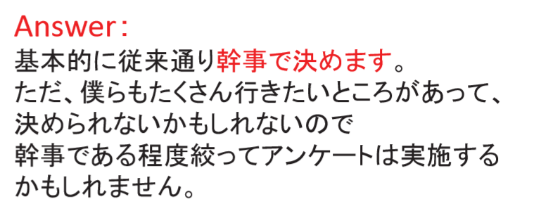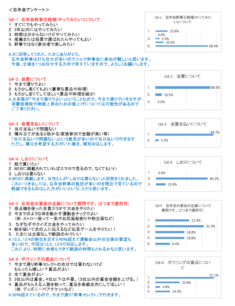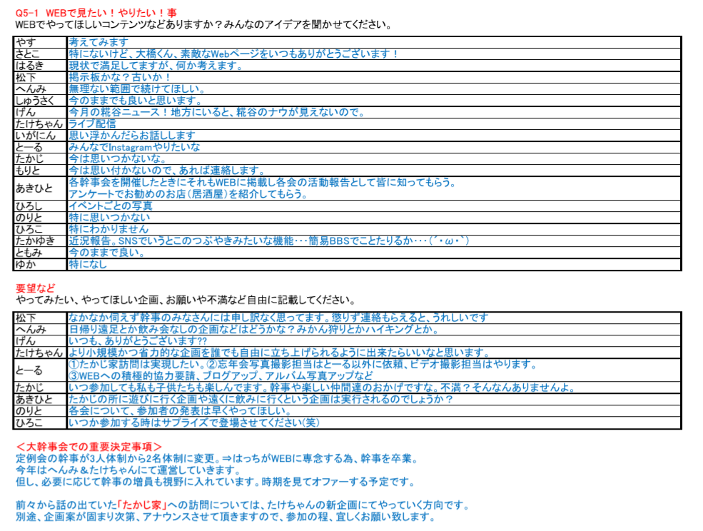 2nd ひとびとアンケート 『 全力中年 』 みなさん、ご協力ありがとうございました。 アンケートの結果が完成いたしました 今年度もどうぞよろしくお願いいたします。 旅行会 家族会 定例会 忘年会 WEB/総合 旅行会 家族会 定例会 忘年会 WEB・総合 // こーじやのひとびと。